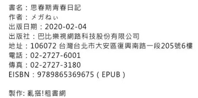電子書則是由"悅文社"代理(有白海苔條),書名是《思春期青春日記》