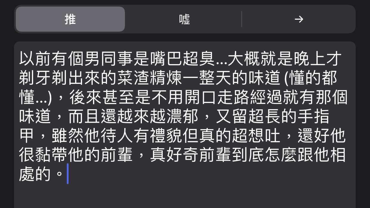 → BLUEPAPER : 通常是沒有自覺的嗎?說不定你根本味道超重別人不07/23 09:03