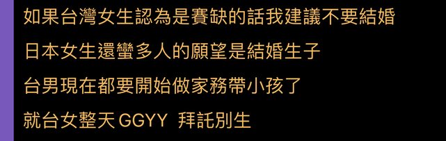 推 lavena : 日女的結婚等同不上班的飯票,台女自賺自花還被檢討08/19 13:46