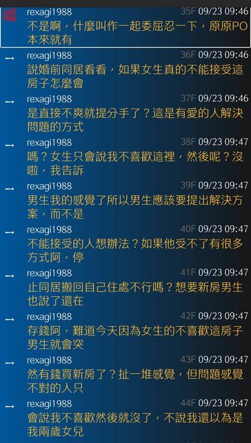 → ckzzz : 如果你有同居過,你就知道了,價值觀生活習慣不同 09/22 09:58