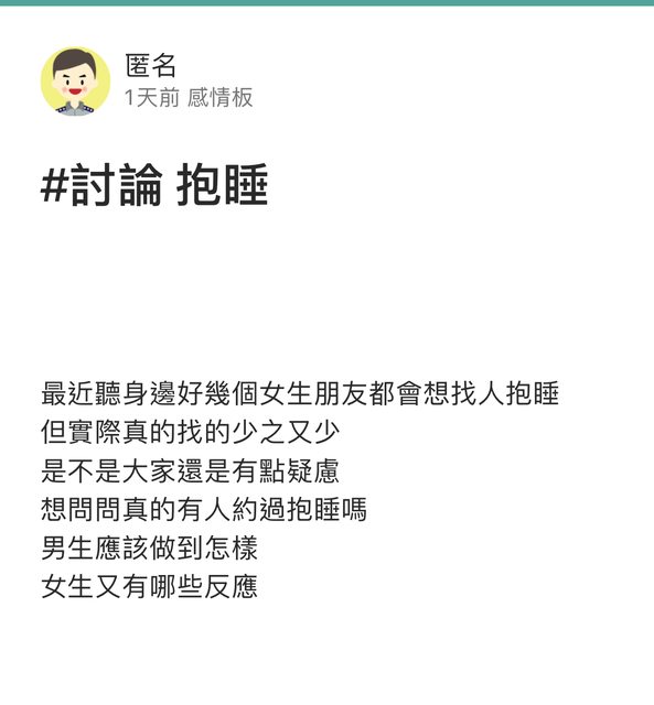 推 newtypeL9 : 我喜歡抱另一半睡覺 但不會想找不熟的抱睡 10/02 10:43