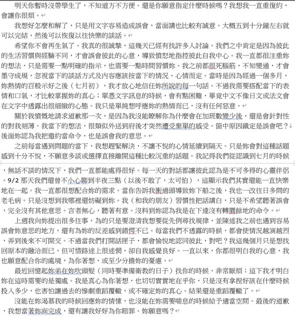 - 男方表示希望能有機會解釋清楚,挽回關係。