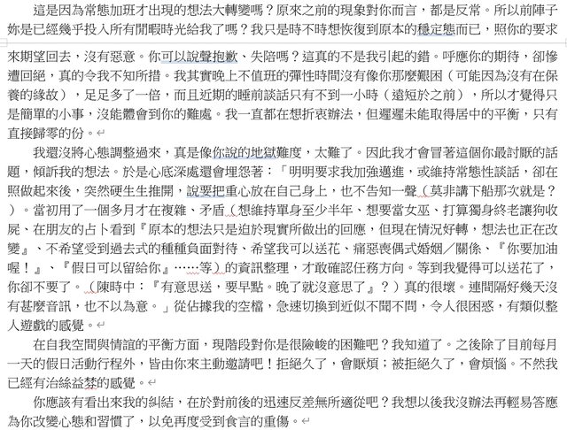 : 所以我猜想她比較喜歡一起享樂的感覺。最近回想起來,在她開始常態加班之後,最恰當