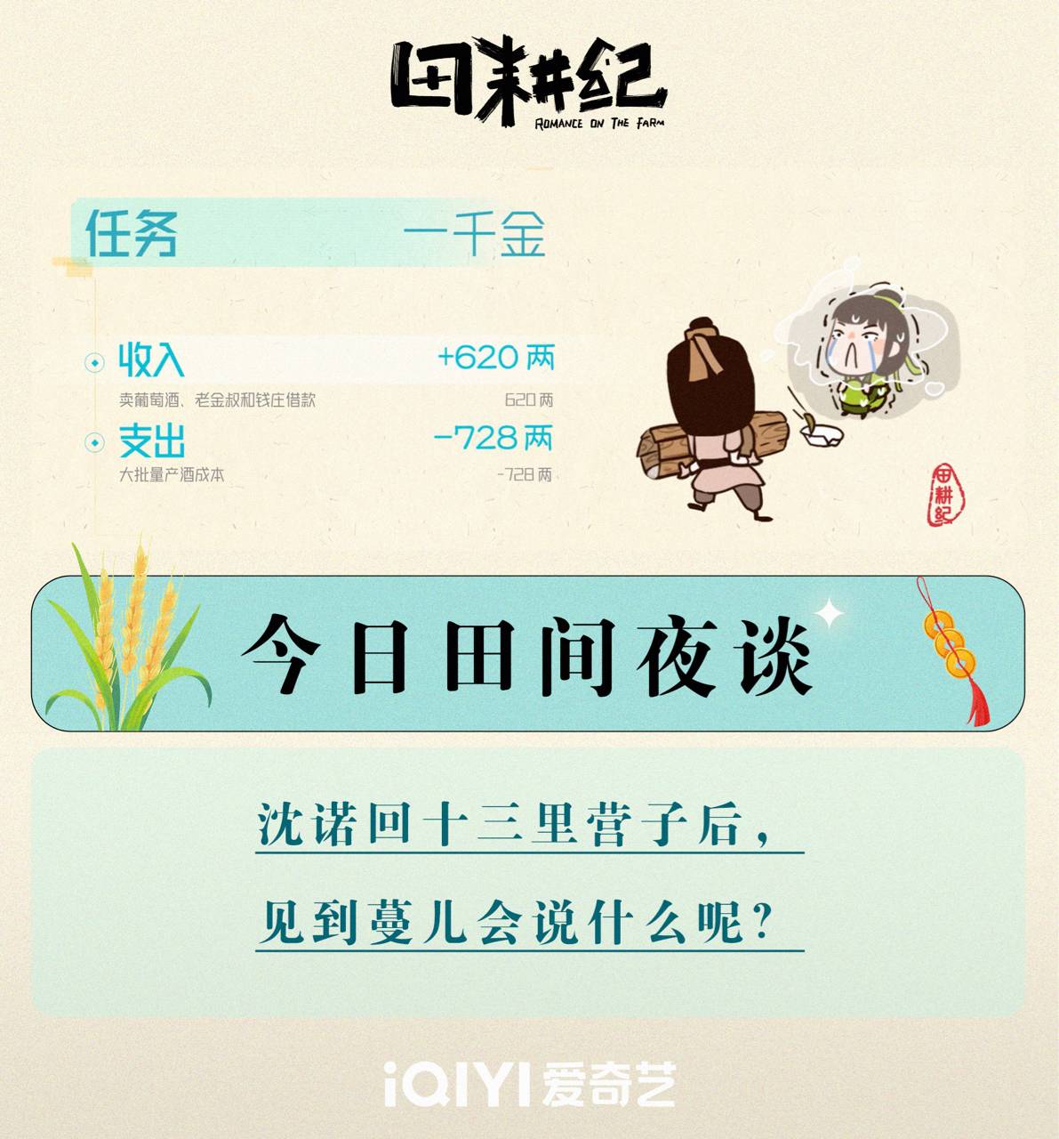 10月14日起,VIP會員每周六至周三19:00各更兩集鎖定 (首日VIP集,免費兩集)愛奇藝 田耕紀,有田有閒,撒歡搞錢! 《田耕紀》是由愛奇藝出品,中文奇蹟聯合出品 洪泠執導,金媛媛擔任編劇 大綱 本劇改編自作者弱顏的小說《重生小地主》,以宋代田園農耕生活為背景 ,講述了沈諾 與連蔓兒攜手智鬥親戚,種田經營,發家致富,並在過程中相知相愛的故事 。 家宅很寧版預告 https://video.weibo.com/show?fid=1034:4955954379423804 人物關係圖 https://i.imgur.com/yPNtgxX.jpg