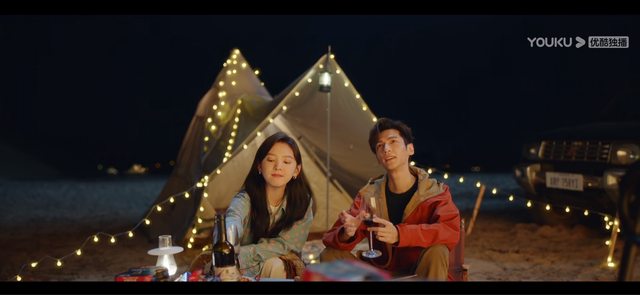 在野外紮營,但車上的水被小方姜姜偷置換成了啤酒跟紅酒。所以兩人就在野外烤著肉喝