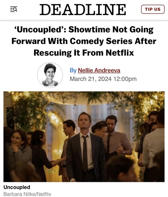 《中年失戀日記》(Uncoupled)在 2023 年初遭到取消後,時隔一個月傳出由 Showtime
