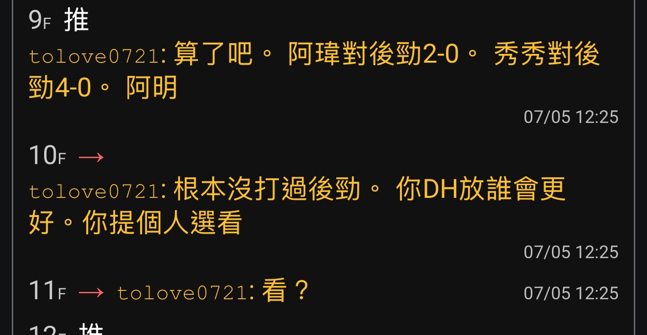 → tolove0721: 黃棒棒打擊不行。不能先發三壘。然後他當時定位是 07/06 01:23