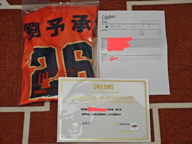 球衣*1 證書*1 訂單資訊*1