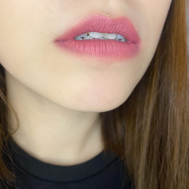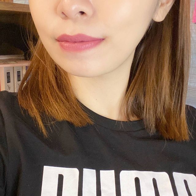 神奇的是手上試色偏深玫瑰粉,但上唇之後就是美的淡粉玫瑰色!擦一點點再抹開,就很