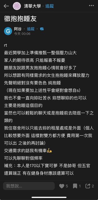 所以想跟有同樣需求的女生抱抱睡來釋放壓力