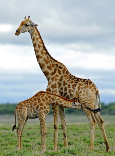 有網民貼出現實中長頸鹿媽媽哺乳的照片,指長頸鹿奶頭的確長在較低位置。(互聯網圖片