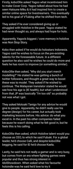 接著,Kobo 問他是否會推出 Holostars Indonesia。Yagoo 說他希望在可預見的未來,專