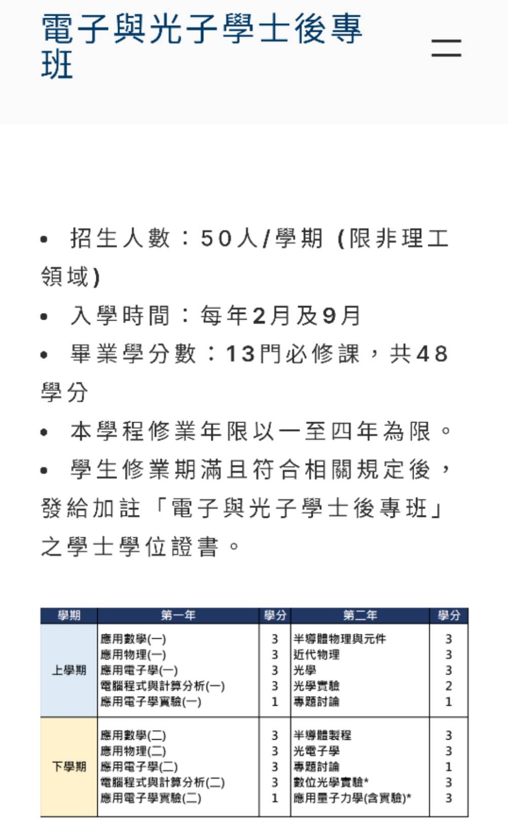 今年9月入學的學士後電子與光子學位學程新生,將在2年內修習應用物理、應用電子學、