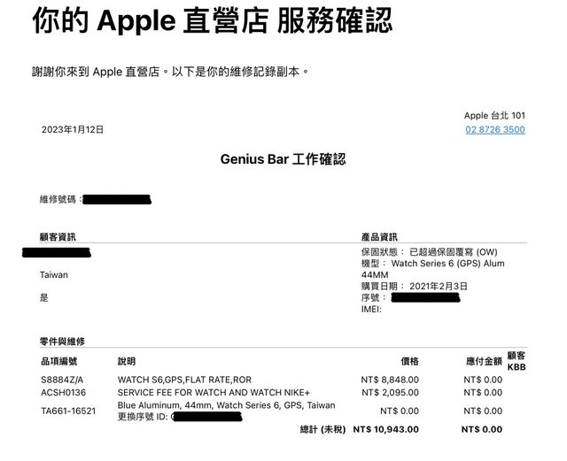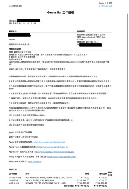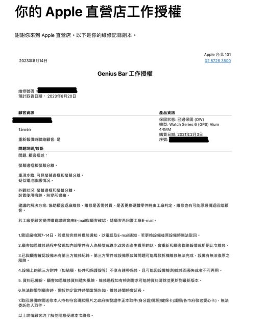 標題[心得] Apple Store 101維修Apple Watch S6 心得