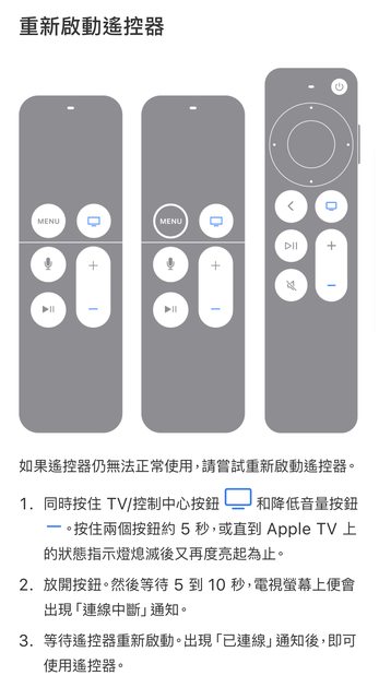 後來依照蘋果官網的說明重新啟動遙控器就恢復成正常狀態