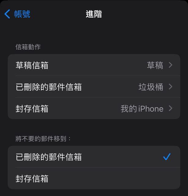 是不是如第二張圖所示在手機裡的設定—>郵件—>帳號—>進階