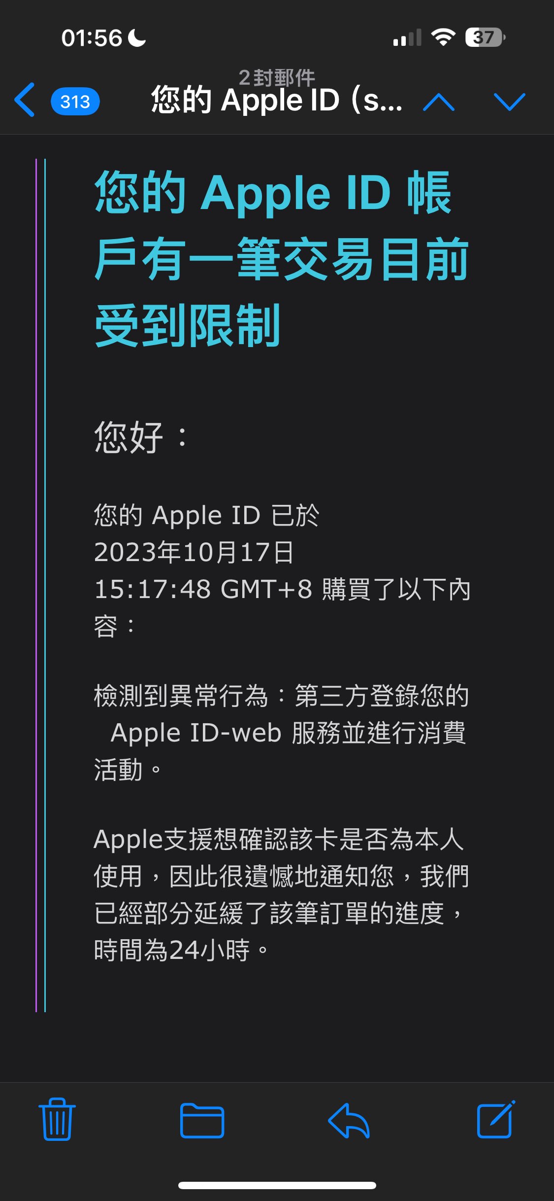 推 m6699: 我在9/12就收到iPhone15的盜刷Mail了哦,假的10/23 09:40