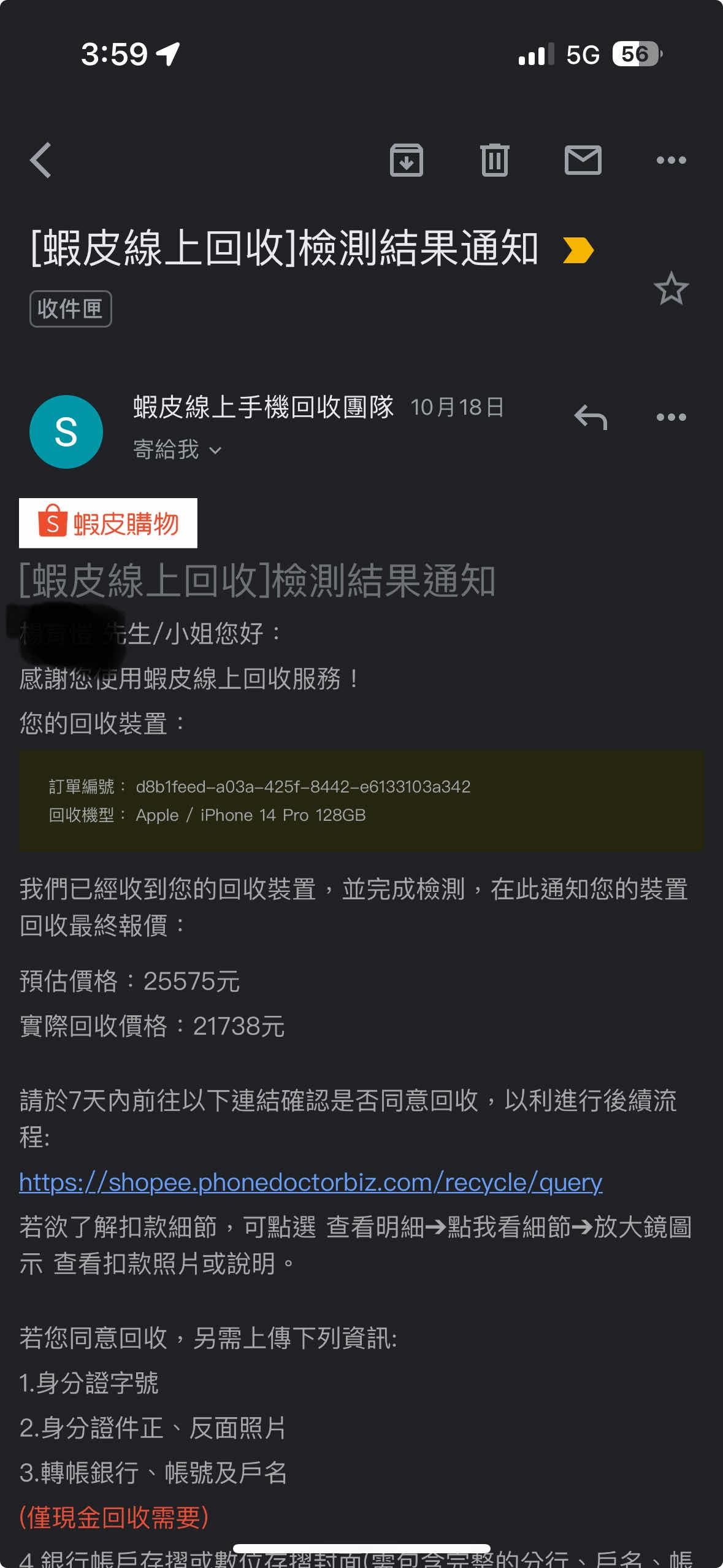 → qoo770819: 蝦皮回收真的爛,檢測久就算了,還亂扣錢,還好我有錄 10/23 16:05