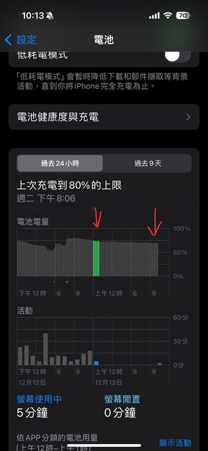 機型名稱: iPhone 15 pro 系統版本: 17.1.2 問題描述: 最近剛拿到新的手機,觀察幾天發現一個問題不知道正不正常, 1.如果把電量充到80%以上,晚上睡覺關掉所有藍芽,網路等等,也確認沒有任何app在背景執行,則早上起來電量1%都不會掉 2.但如果電量不到80%,一樣情況下(關閉所有網路,藍牙等等),早上起來可能會掉7~10%不等,想問大家這樣算正常的嗎? 補充說明: 附上截圖(從79掉到70 https://i.imgur.com/iFCPG2N.jpg