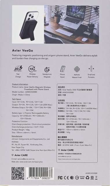Avier VeeGo 5000可立式磁吸行動電源(AVMGVG05BK)規格: