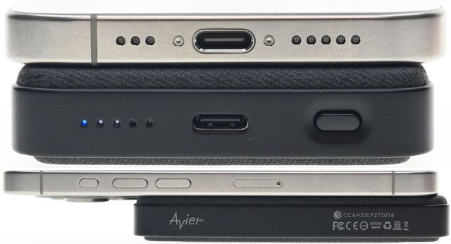 ▼下側面中間有USB-C埠,右邊有按鈕,左邊有無線充電燈號(最左)及4個白色電量燈號,
