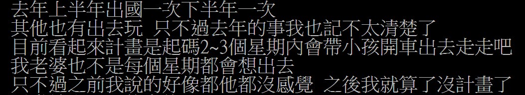 → focusjj101 : 去嗎?一家三口出去玩你也不開心,乾脆自己去就好, 03/25 18:18