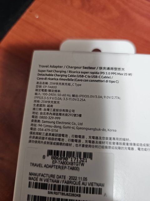 欲售物品:三星 快充旅充組 ( 25W ) EP-TA800XBTGTW