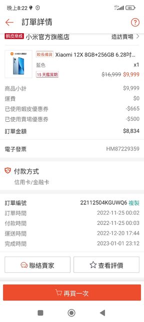 購買日期:2022/11/25下單;2023/1/1號才收到貨