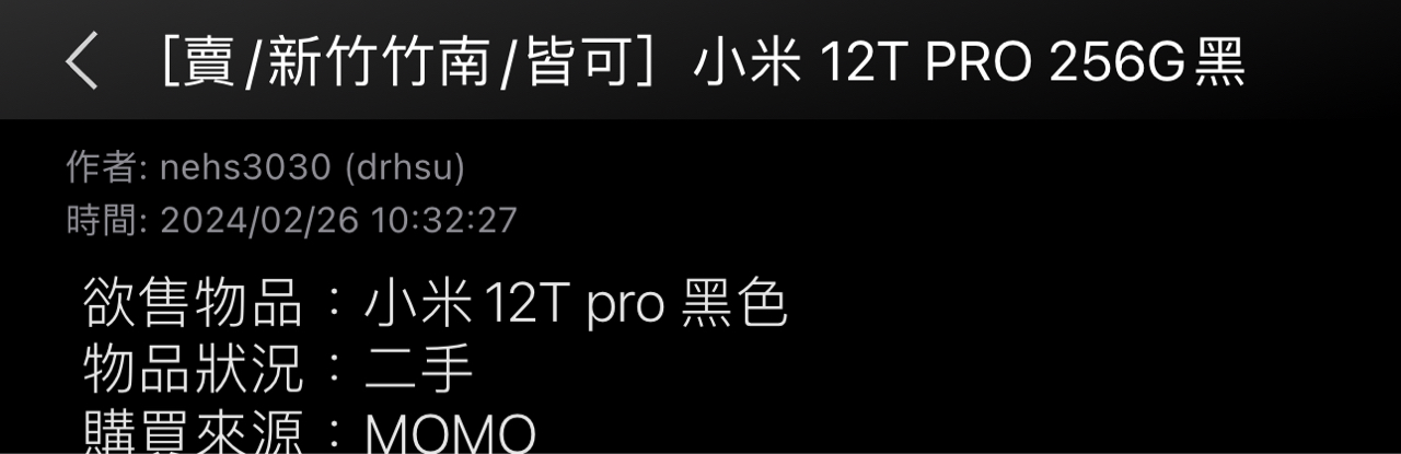 標題[賣/新竹竹南/面交]小米 12T PRO 256G黑