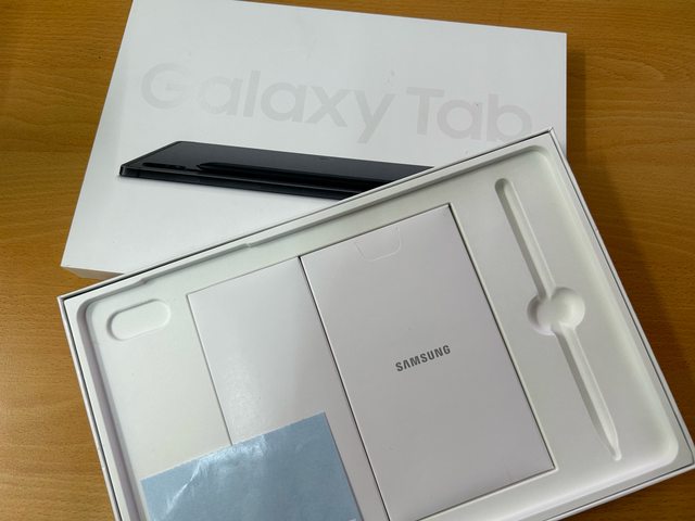 盒裝內含:平板本體、S Pen、傳輸線(未使用);另有後來購入之原廠鍵盤皮套(英文
