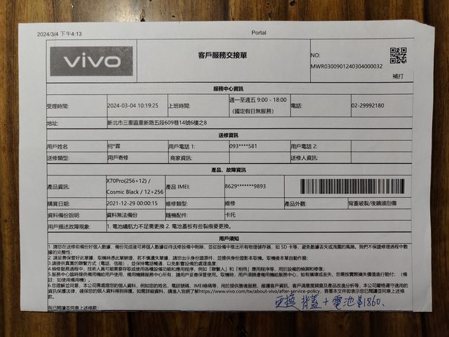 今年3月時發現電池背蓋有裂痕,就送廠連同電池一起更換
