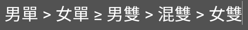→ Rx770 : 他的文裡面是:男單>女單 男雙>混雙>女雙 08/06 23:22