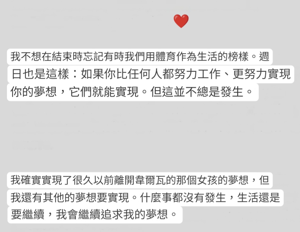 → YiJane : 了 還有其他夢想才會努力回到賽場吧 所以還會繼續 08/06 21:24