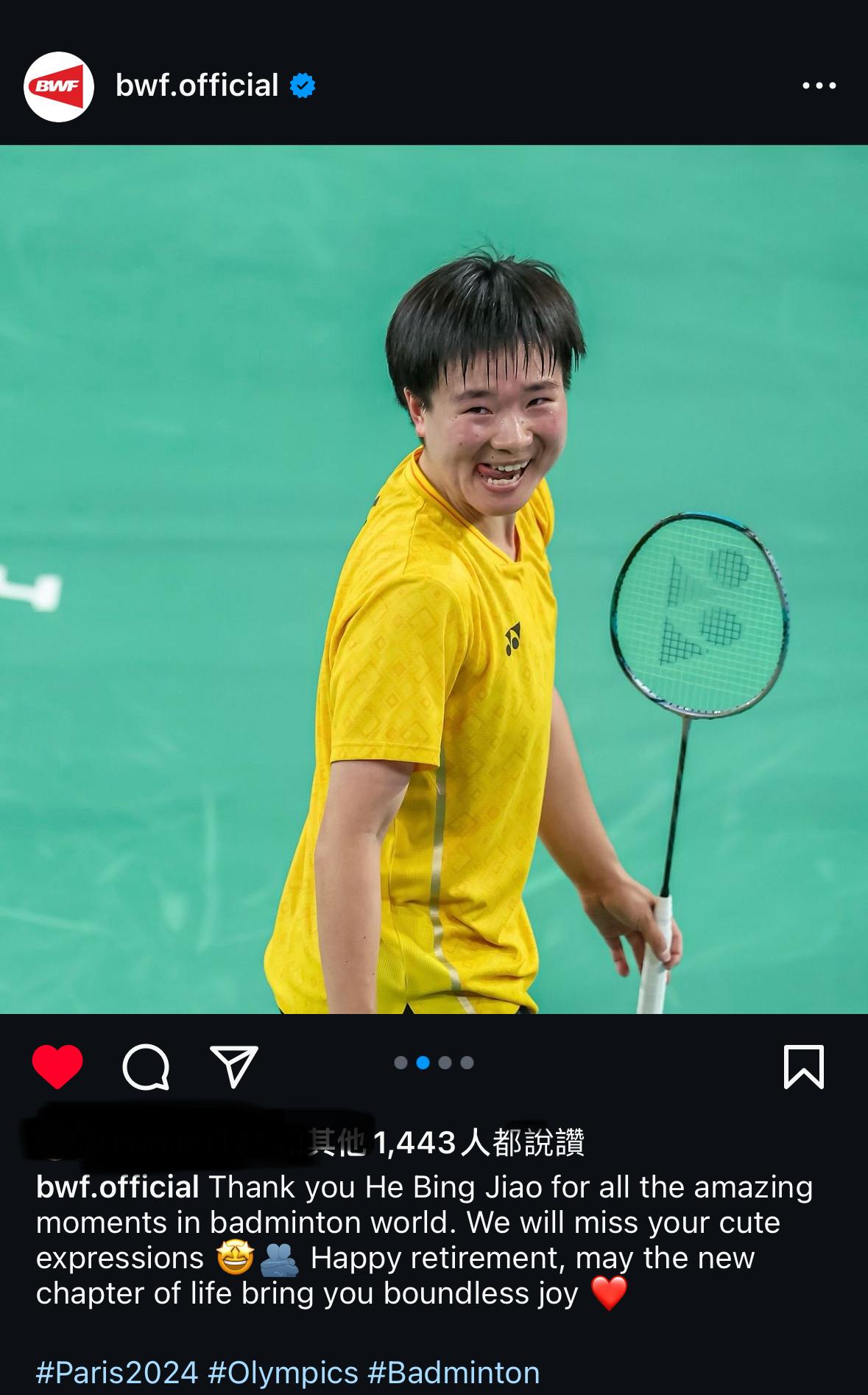 推 wenteng : 看BWF的IG已經貼文祝阿嬌退休快樂了QQ 08/13 14:46