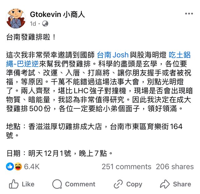 → panhoho: 領免費雞排不就是享受熱鬧嗎?排隊是一定的。下次該在台 12/01 21:42