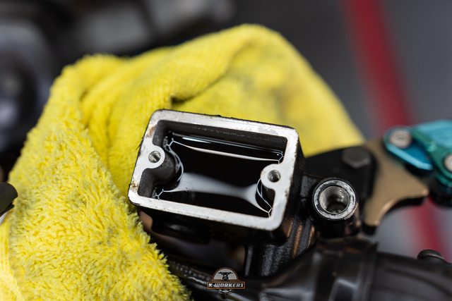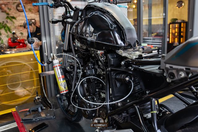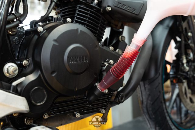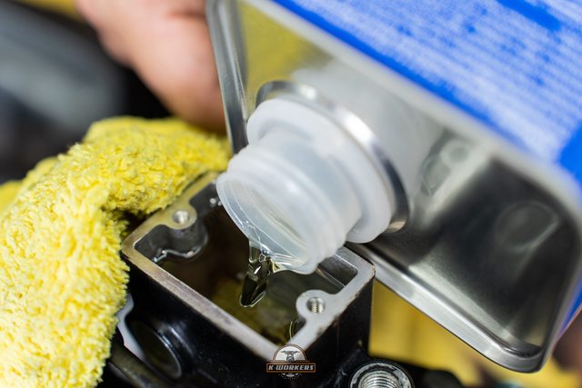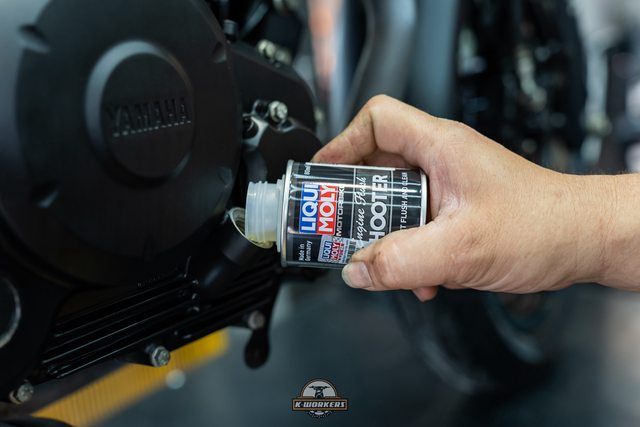 倒入LIQUI MOLY摩托車引擎內部清潔劑,不傷油封也適用於摩托車濕式離合器車種
