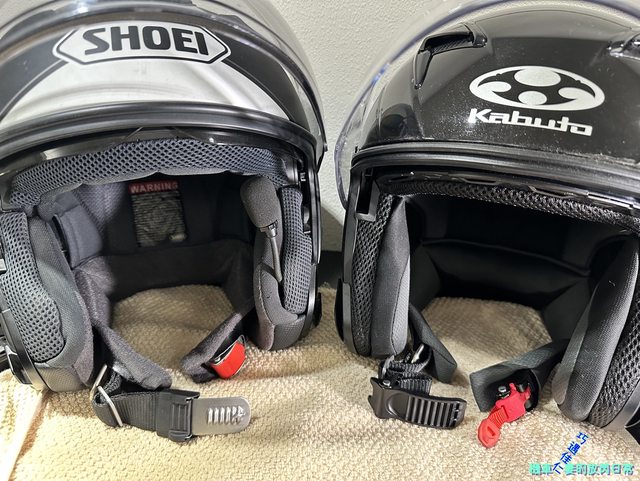 Shoei J-Cruise II是金屬插扣,脫安全帽、解插扣需下撥紅色撥片,