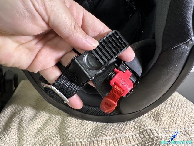 頤帶部分是採用塑膠插扣,要脫安全帽、解插扣時只要拉下紅色拉繩就可以解開。