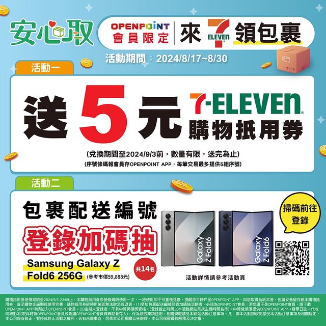 【活動名稱】:包裹安心取-全平台取件送5元購物抵用券加碼抽手機