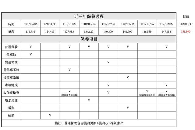 表格)+原廠保養紀錄,車子沒有待修的情況,今年一月有給原廠大保養+更換水箱總成,