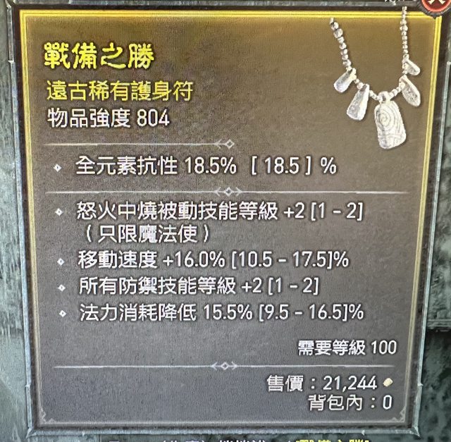 物 品:100lv項鍊 防禦+2 移動速度16% 法力消耗15.5%