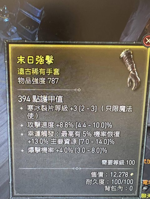物 品:100lv法師裂片 攻速 回魔 洗爆率