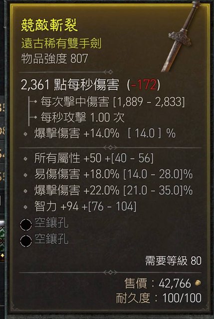 標題[競標] D4 807雙手劍 易傷/爆傷/智力/全屬
