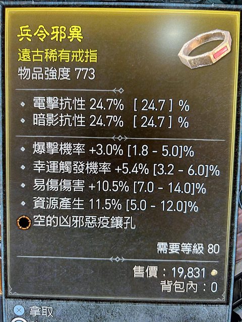 標題[競標] D4 S1 戒指-幸運/易傷/資源/暴率