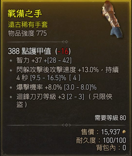 標題[競標] D4 S1 俠盜 迴鋒三 頂爆率 閃避攻速 手套