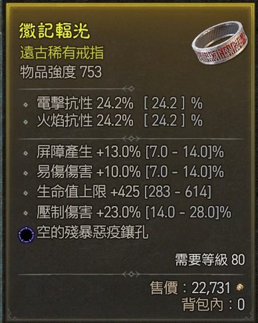 物 品:遠古戒指 屏障13% 易傷10% 生命425 壓制23% 殘暴