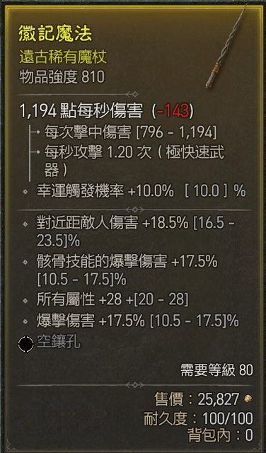 物 品:810遠古魔杖 近距18.5% 骸骨爆頂17.5% 所有屬性頂28 爆傷頂17.5%