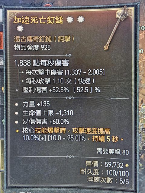 物 品:三太古單手鎚 力量/生命/易傷 物品強度925