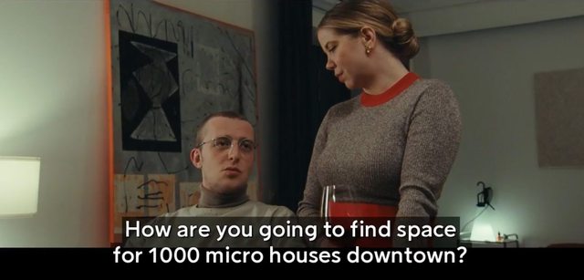 E01 的反烏托邦世界完全不是這個樣,我們眼見建築女主角 Julie一身長衫走在奧斯陸街頭宛如高端社畜般:她有建築學位但沒家世背景沒位給她卡、在大事務所當小妹煮咖啡年復一年從沒有機會、工作數年薪水都繳房租銀行帳戶仍空空如也、年近三十在奧斯陸大都連個窩都找不到何顏返鄉面對父母?這處境和咱當代台北怎這麼似曾相識!眼見本就清冷疏離的奧斯陸在這近未來更加非人了:銀行都用語音系統服務了、要找專人要另花一筆錢、存款不夠貸款直接拒絕沒啥好諮詢、旁邊遛狗的無人機彷彿在笑妳社畜、想在廣場歇腳馬上有人前來要妳買咖啡不買就請妳離開...