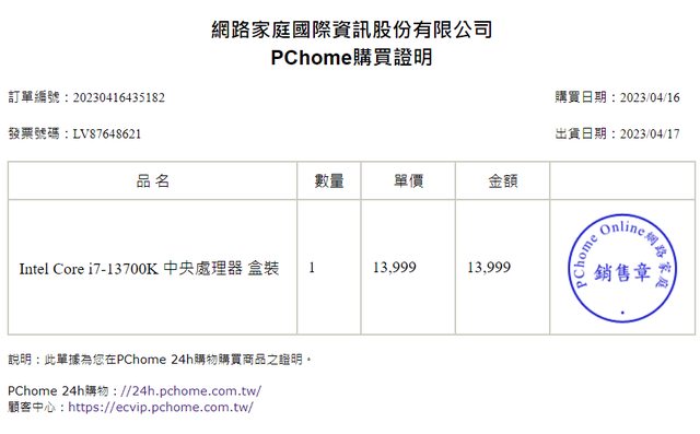 13700K購於PC24H(2023/04/17)